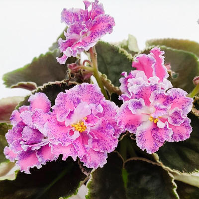 (ND Pervokisshka) Double pink stars with blue fantasy and wide white edge. Green and white TL variegated foliage. Standard.