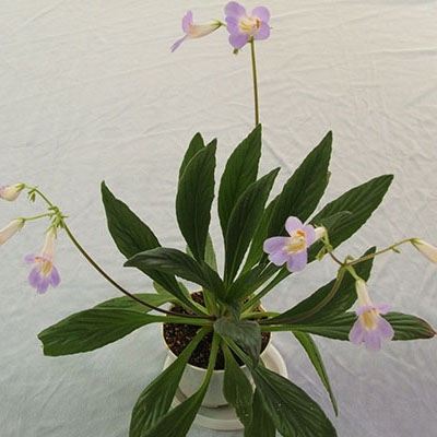 Large, dark lavender blue blooms with with cream white to pale yellow throat. Pointed, serrated, quilted leaves. Easy grower and bloomer.