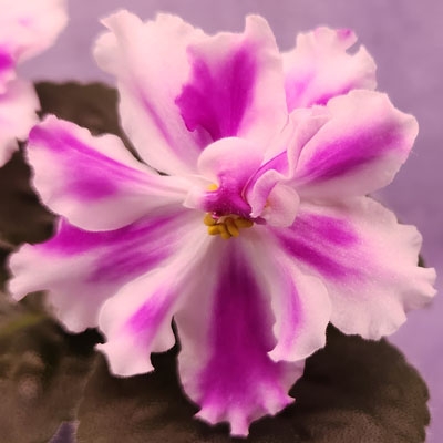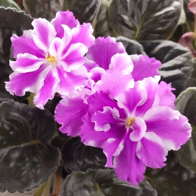 (RS Kniaginia Olga) Large semidouble rosy pink stars with white border. Dark green, quilted, foliage. Standard. Very showy!