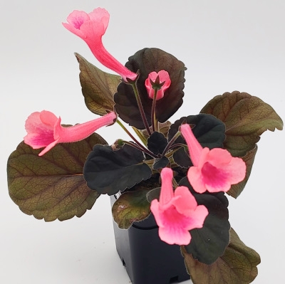 Beautiful salmon-orange blooms with deeper throat. Dark green foliage. One of our favorites.