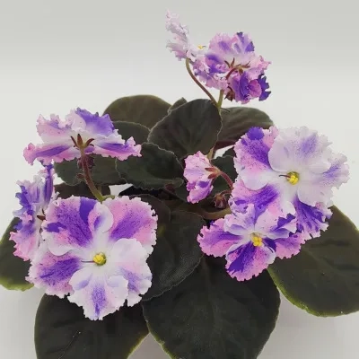 Fringed white pansies with pink thumbprints, blue rays and stripes. Medium green foliage. Standard chimera.