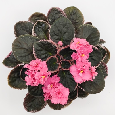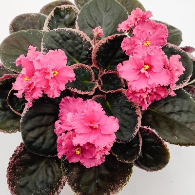 Excellent African Violet! Beautiful coral multiple long-lasting flowers stand above magnificent large dark green variegated, perfectly formed, foliage that spans 15" across, definitely great plant for show.
