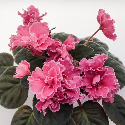 This violet's flowers have a deep pink based red color and the white penciling is great. The foliage is a little smaller and more sparse than my other violets, but the flowers make up for it by far. I get lots of compliments on this one.