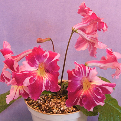 This plant arrived with two big, beautiful leaves. It quickly went on to produce a flower, vivid pink stripes on pastel pink, with a yellow throat. Even more luscious than the picture.