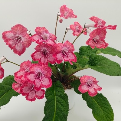 Rose and salmon colored blooms with red and white streaks in throat, salmon edging. Very pretty! (Tenney/LLG)